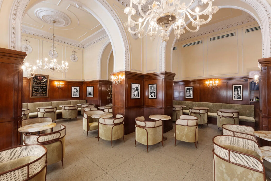 Rendering su base fotografica per reinterpretare gli interni dello storico Caffè GILLI, Piazza della Repubblica, Firenze. Un nuovo layout firmato dall’architetto Paolo Becagli, capace di preservare la storicità dell’ambiente e, al contempo, di rinnovare arredi, pavimenti e sala da tè con raffinata continuità estetica. / Photographic-based rendering reimagining the historic Caffè GILLI in Florence, with architect Paolo Becagli’s layout preserving its heritage while elegantly updating furnishings, flooring, and the tea room.